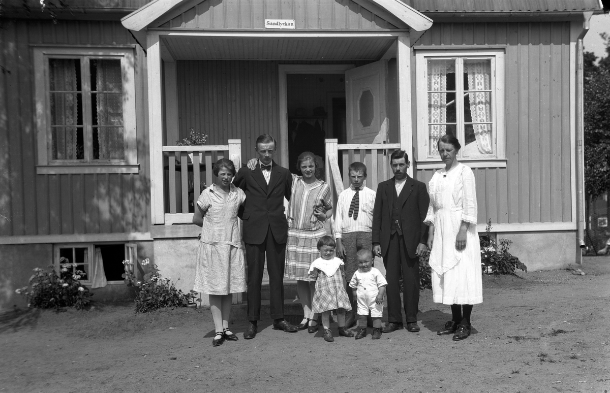 En familj samlad utanför ett hus kallad "Sandlyckan" i Jönköping.