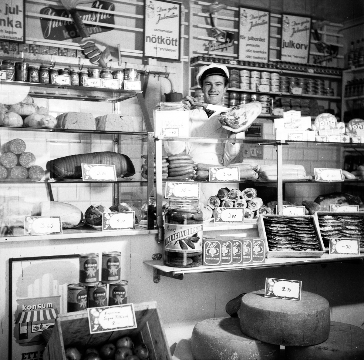 En manlig expedit bakom disken i Konsum-Göta i Jönköping, vid juletid.