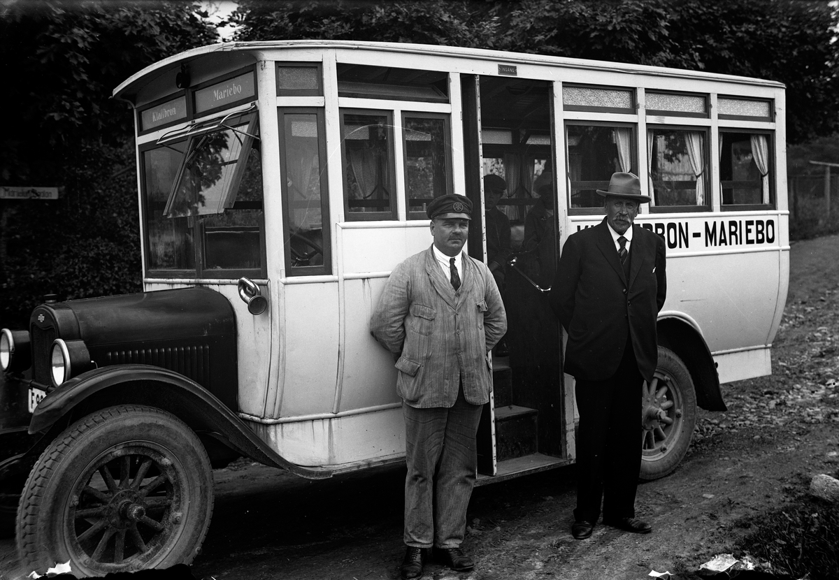 Två män, till vänster Ernst Johansson, står framför bussen som går mellan Klaffbron och Mariebo i Jönköping. Bussen är av fabrikat Chevrolet från år 1925-26.