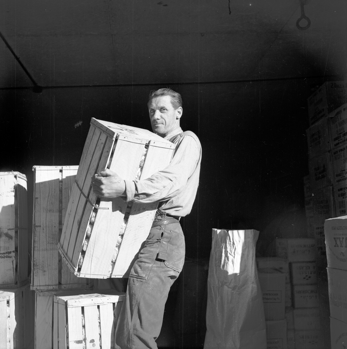 Efter andra världskriget kunde man åter importera frukt, här lastas lådor med apelsiner av i Jönköping.