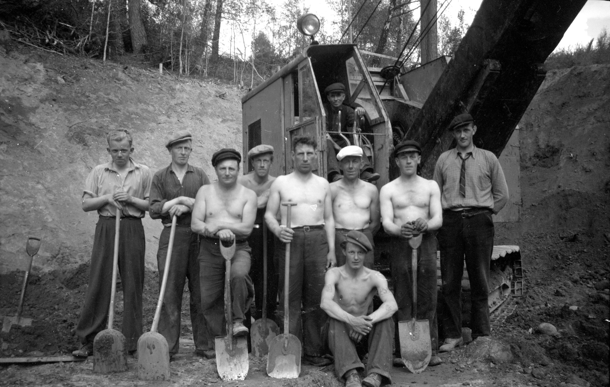 Män med spadar och skyfflar framför en grävmaskin, i Jönköping.