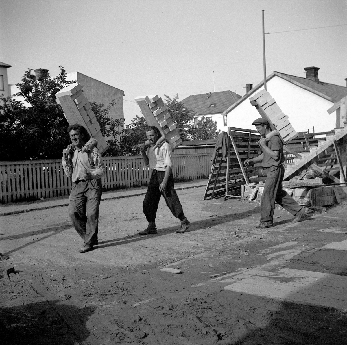 Murare "Habba" Rydell går längst till vänster. Han bodde i "Bostäderna" i Jönköping. Han och två andra arbetare bär en "tegelhare" med tegelstenar på ryggen. Den rymmer 26 stenar och varje sten väger ca 3 kg.