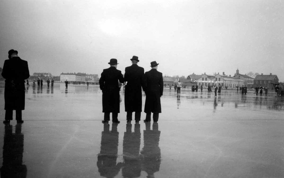 Några män tittar på när människor åker skidskor på Munksjöns is i Jönköping.
