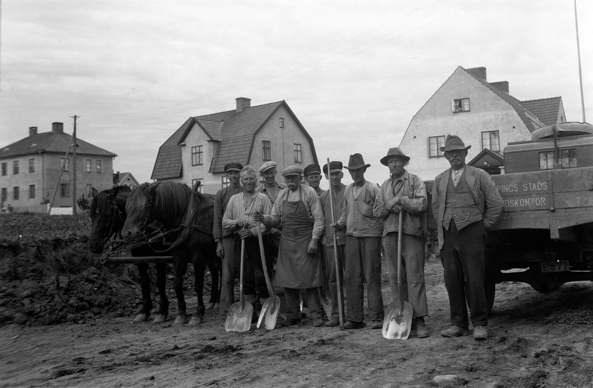 Arbetare med skyfflar vid ett hästspann och en lastbil.