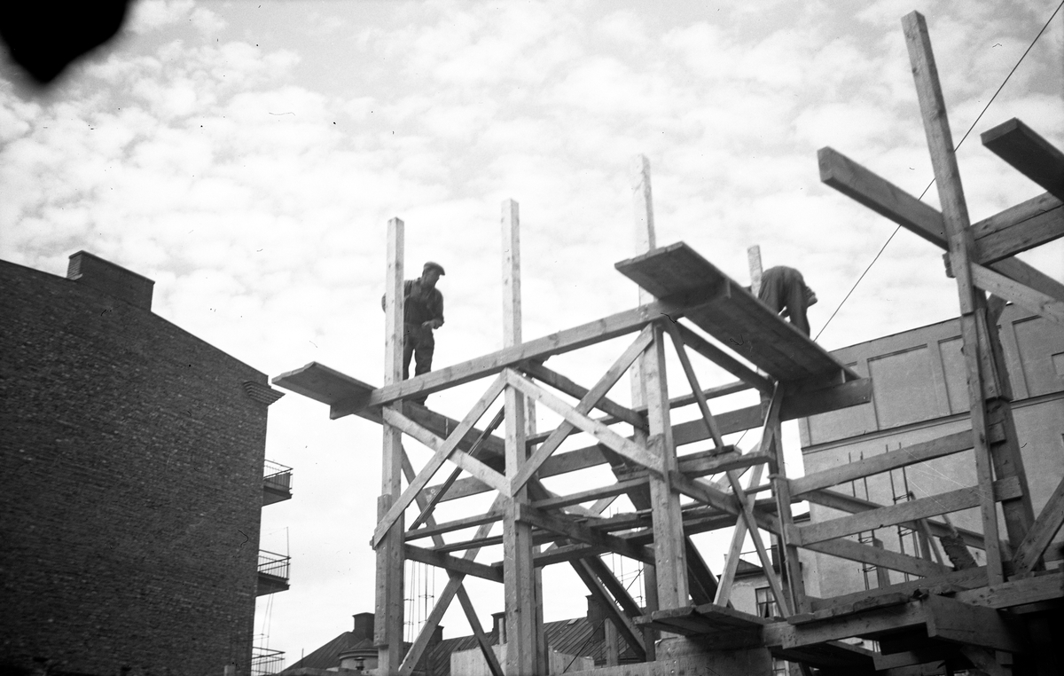 Några män på en byggnadsställning vid ett husbygge i Jönköping.