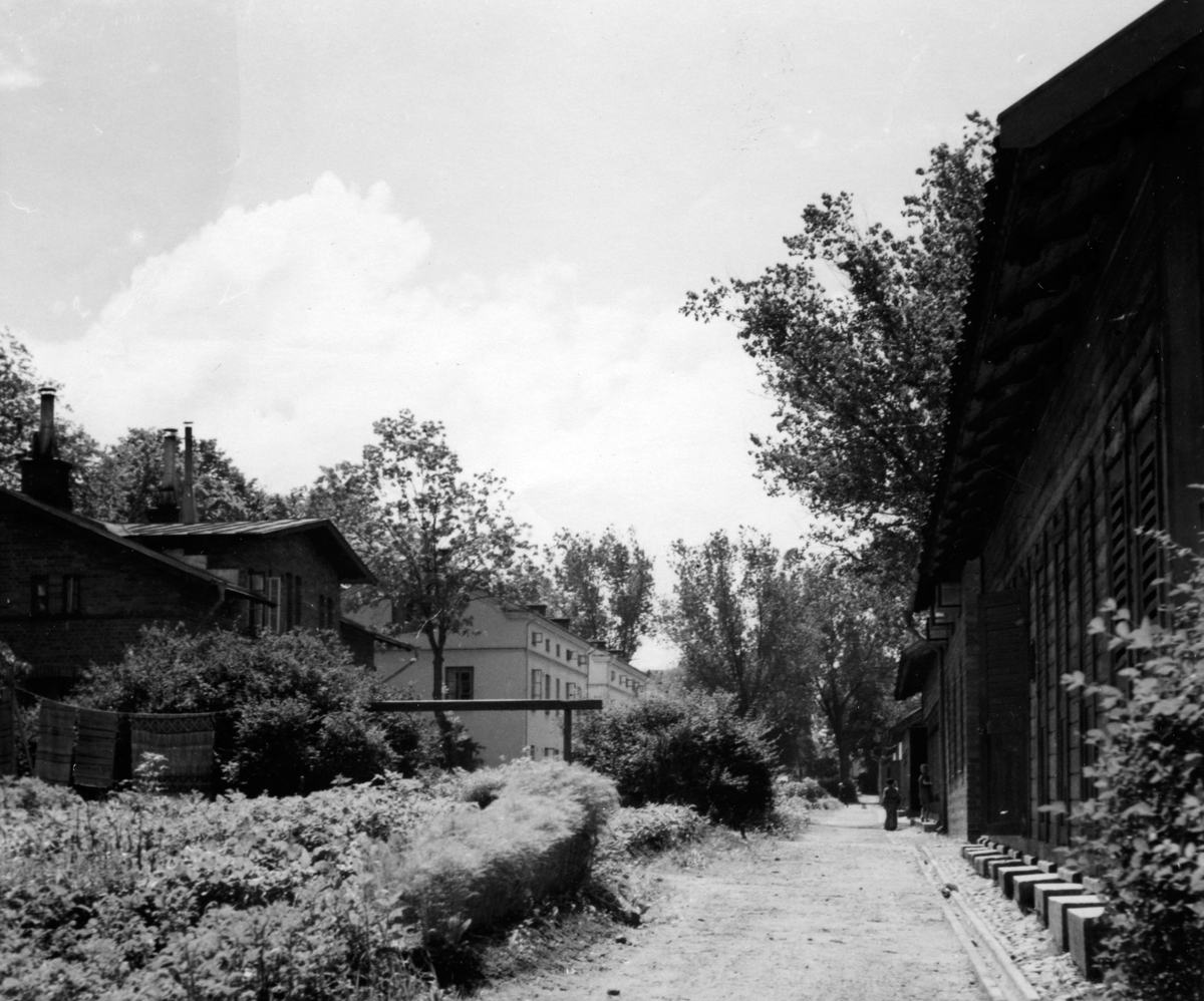 En trädgård mellan bostadshus och uthus vid "Bostäderna" i kvarteret Jägmästaren, Jönköping.