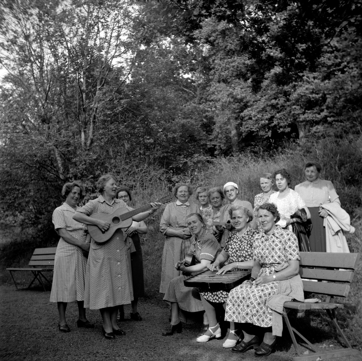 Vätterstugans sångkör. Strängspelande damer från stugföreningen samlade nedanför Vätterstugans sommarhem i närheten av Vista kulle.