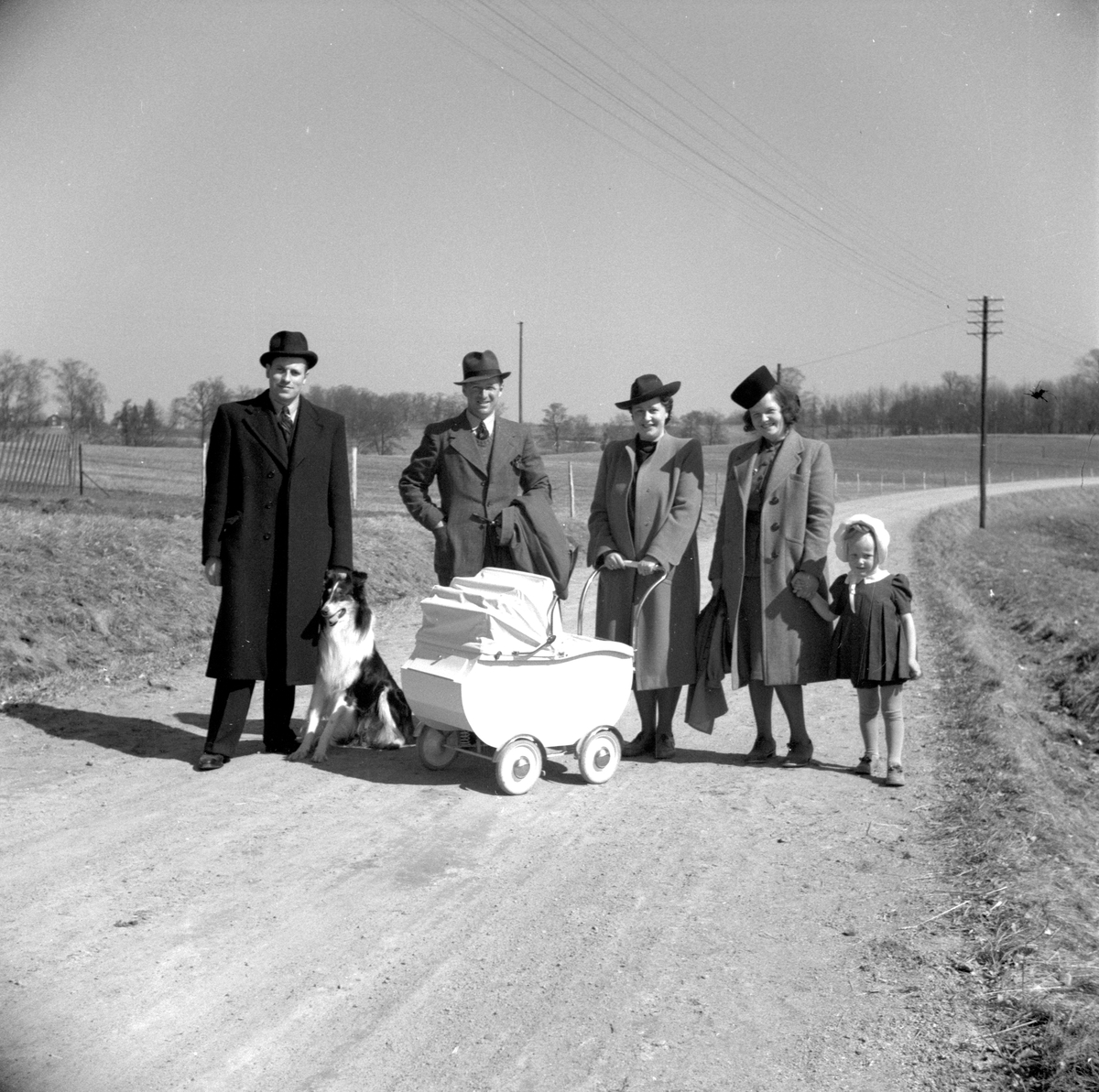 Män, kvinnor, barn och en hund på en grusväg.