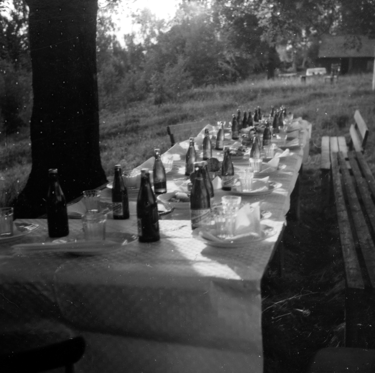 I trädgården står ett långbord dukat. På den vita pappersduken står tallrikar, glas och drickaflaskor.