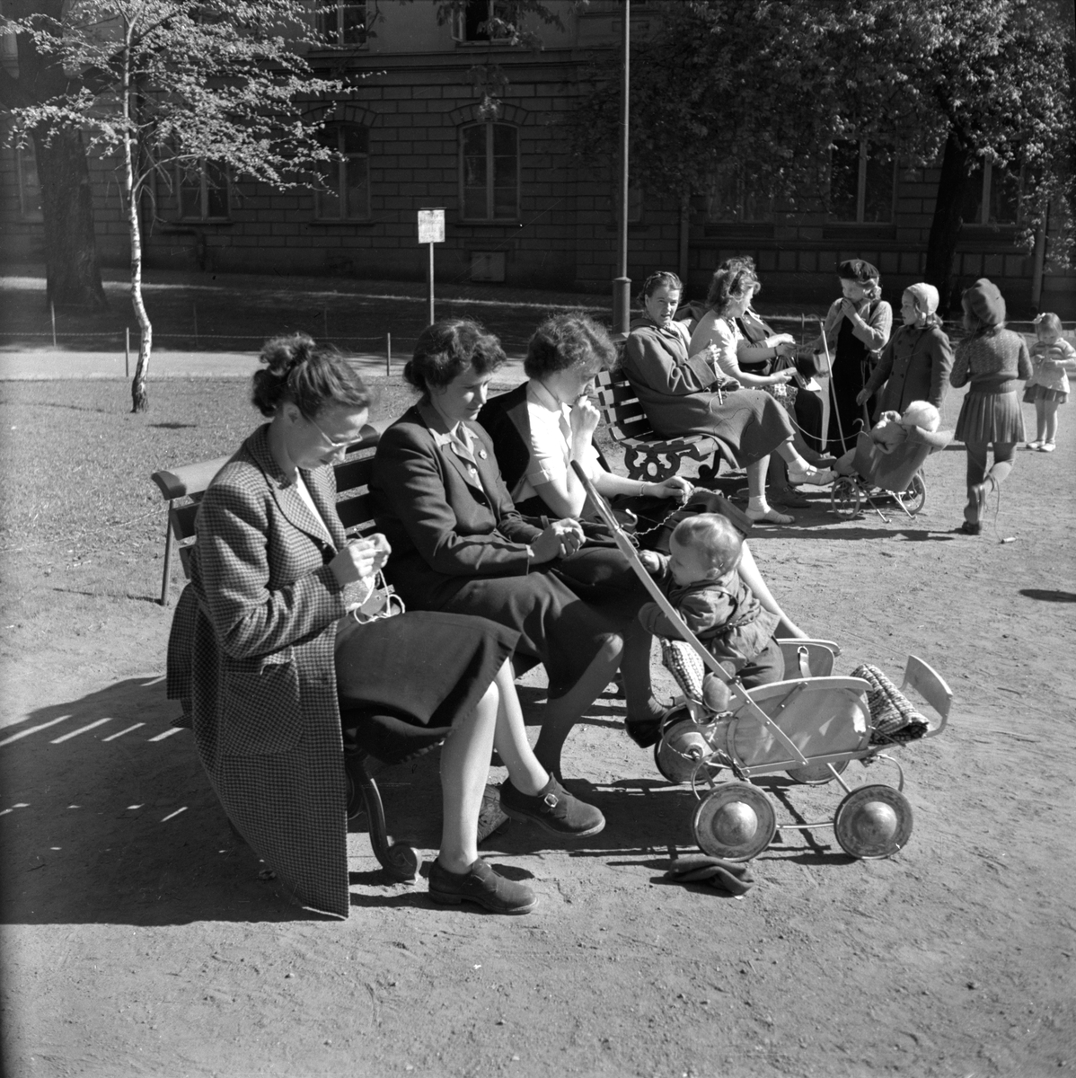 På parkbänkar sitter kvinnor, en del med sina barn och en del sysslar med sitt handarbete.