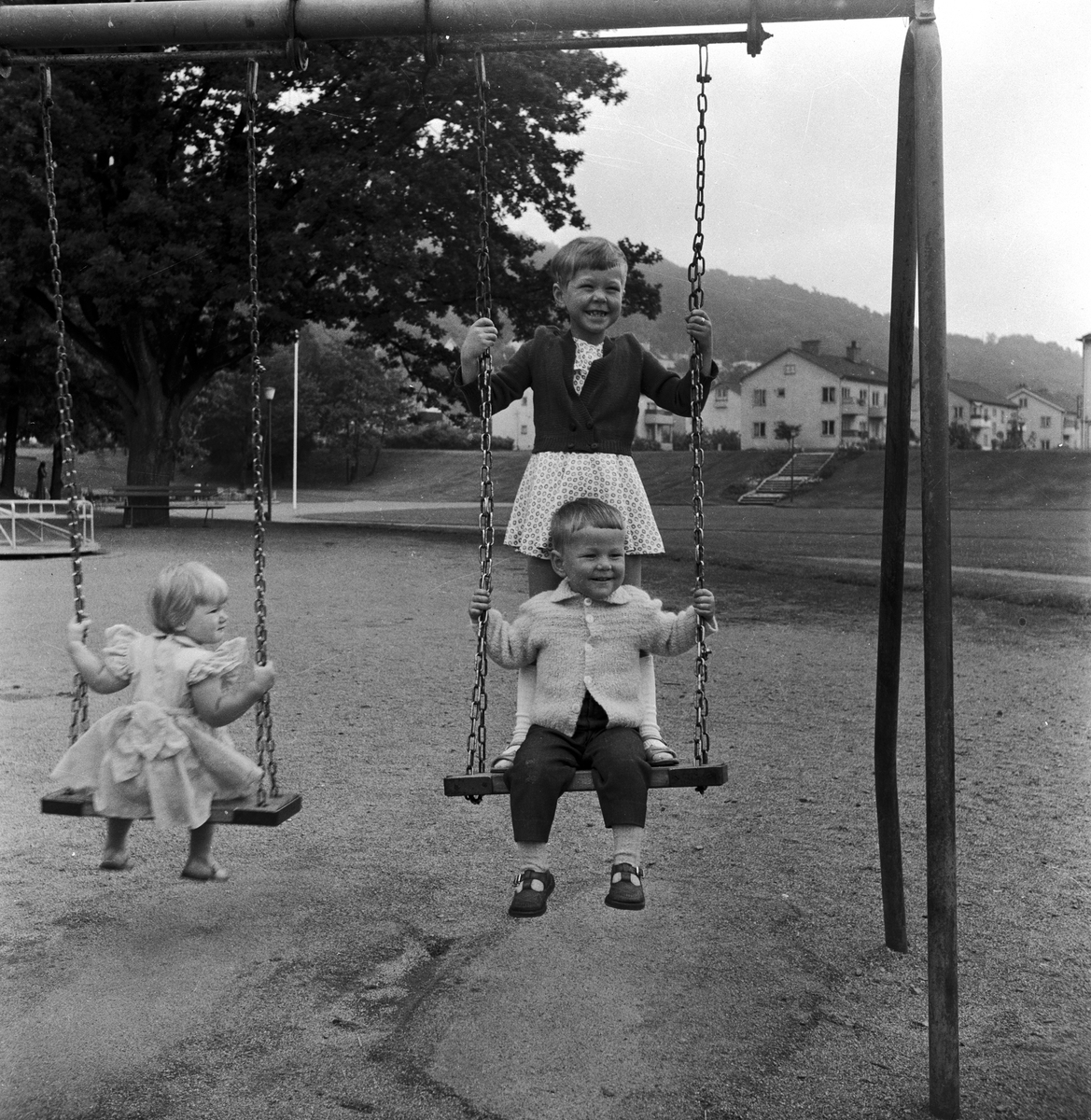 Tre små barn gungar på lekplatsen i Mjölkafållan i Huskvarna.