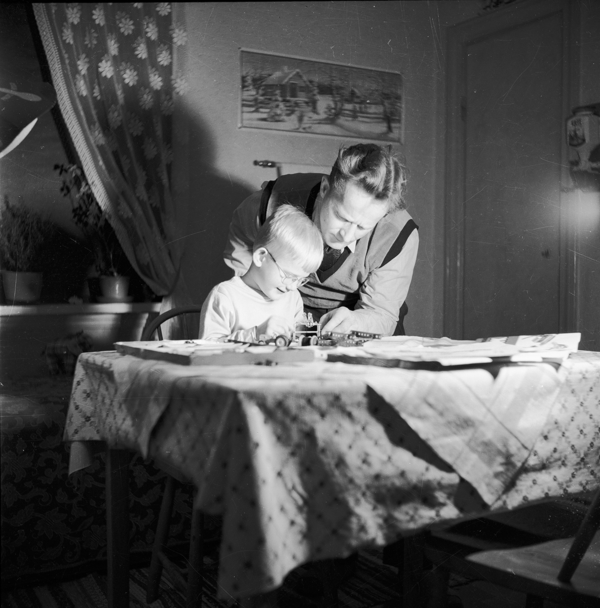 Tom Andersson sitter vid bordet och bygger med Mecano, pappa Evert hjälper till.