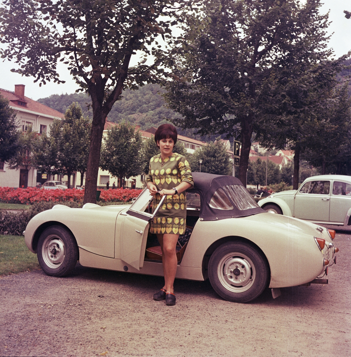 Maggan Gustavsson står vid en liten sportbil på Esplanaden i Huskvarna.