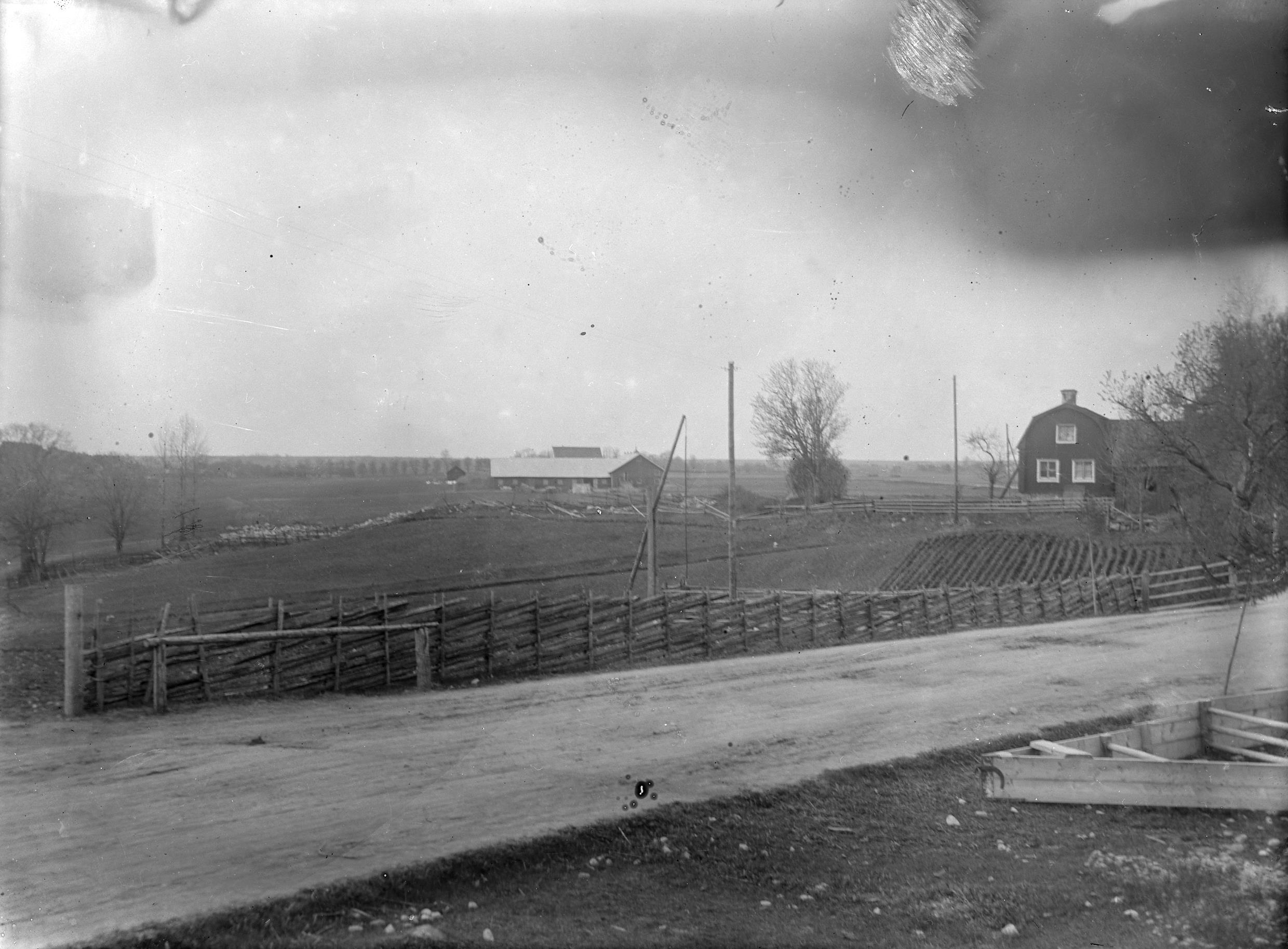 Foto taget vid landsväg, vy över odlingslandskap och hus.