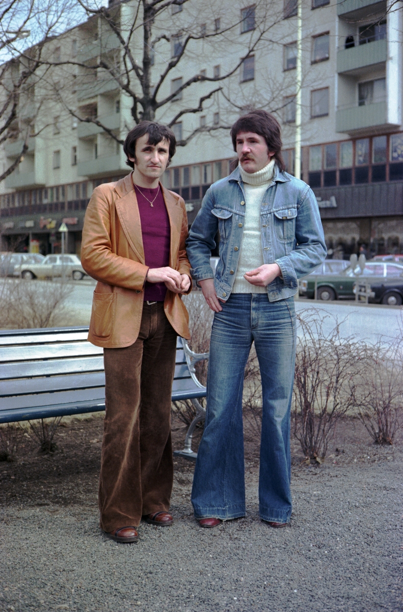 Två män, Janos Barna (1), står vid en bänk på Esplanaden i Huskvarna.