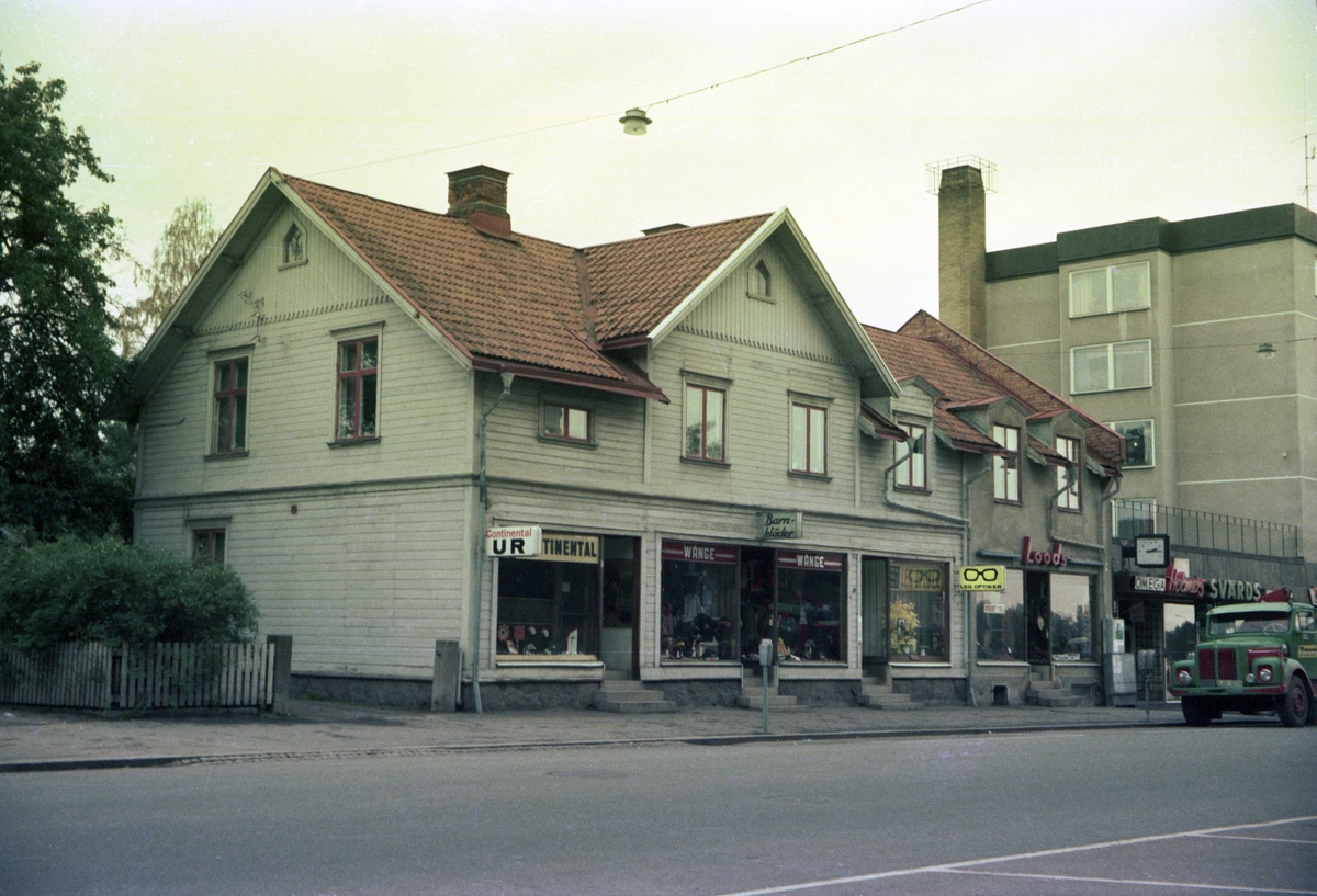 Diverse affärer i ett hus vid Rosenborgsgatan i Huskvarna.