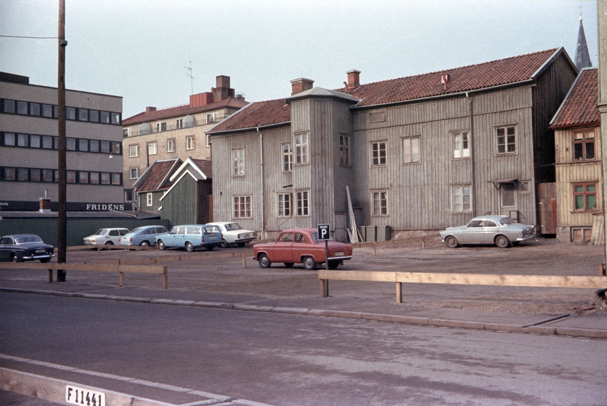En parkeringsplats vid Smålandsgatan i Jönköping. Till höger syns Sofiakyrkans tornspets.