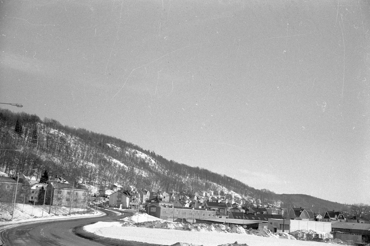 En vinterbild med bostadshus utmed Kruthusgatan i Huskvarna.