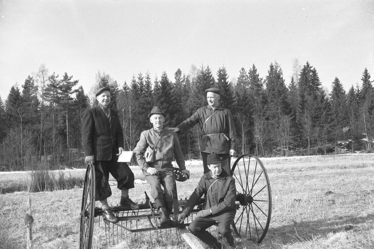 Fyra män på en hästräfsa. Från vänster: Walter Jonsson (1) och Nils Daag (2).