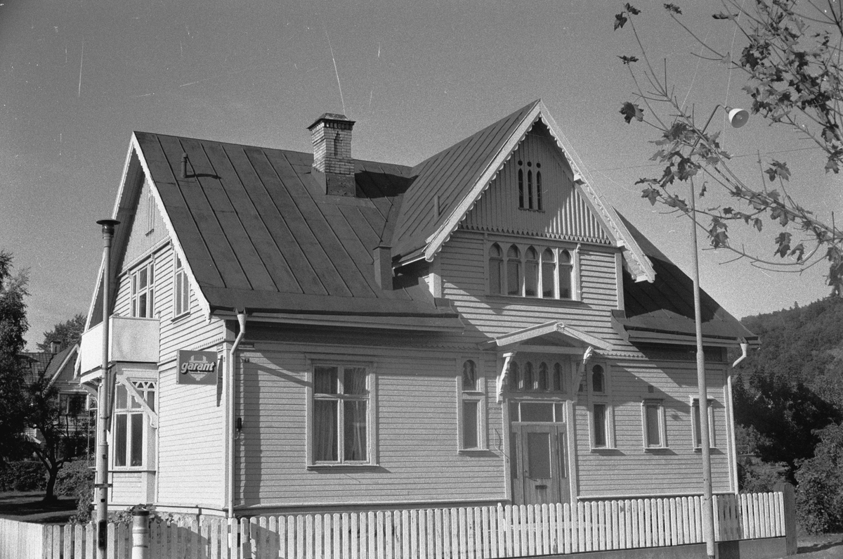 Ett bostadshus vid Drottninggatan i Huskvarna. En skylt med texten "Garant" sitter på gaveln.