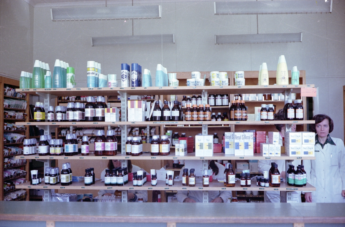 Apoteket i Huskvarna. Personal arbetar bakom läkemedelshyllan.