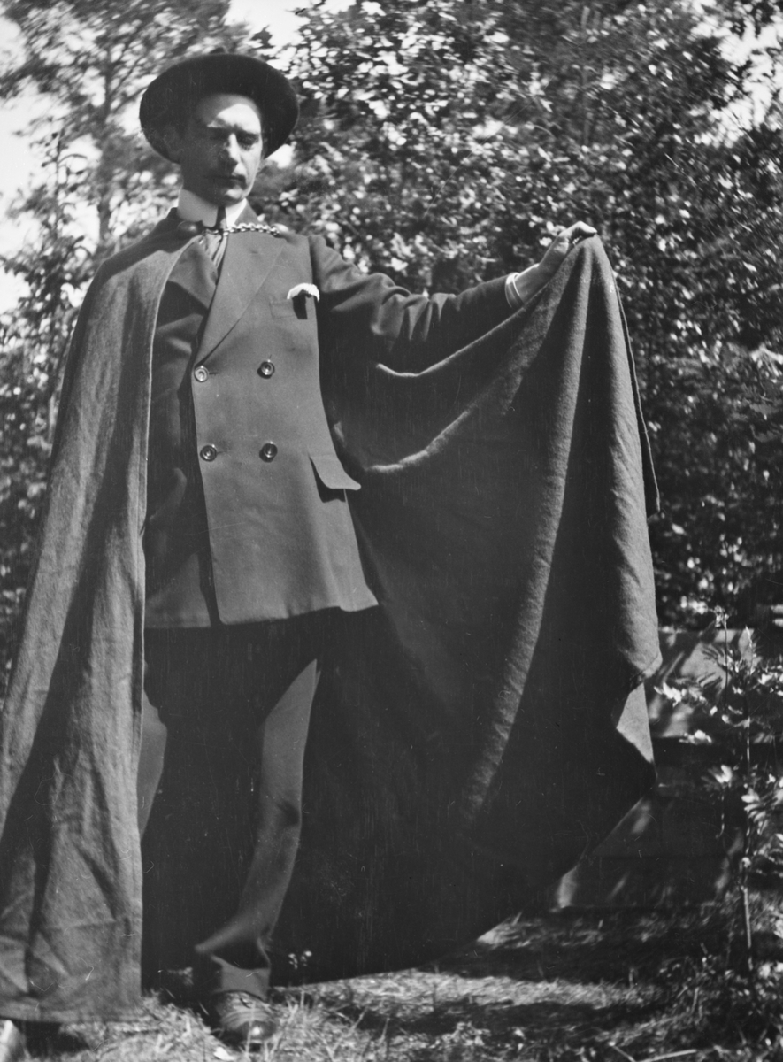 Porträtt av en man iförd slängkappa. Han står som modell till John Bauers målning "Den helige Martin och tiggaren".