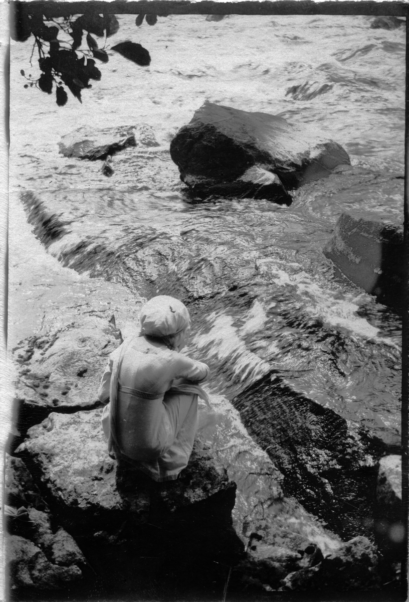 Ester Bauer sitter på en sten vid ett vattendrag.