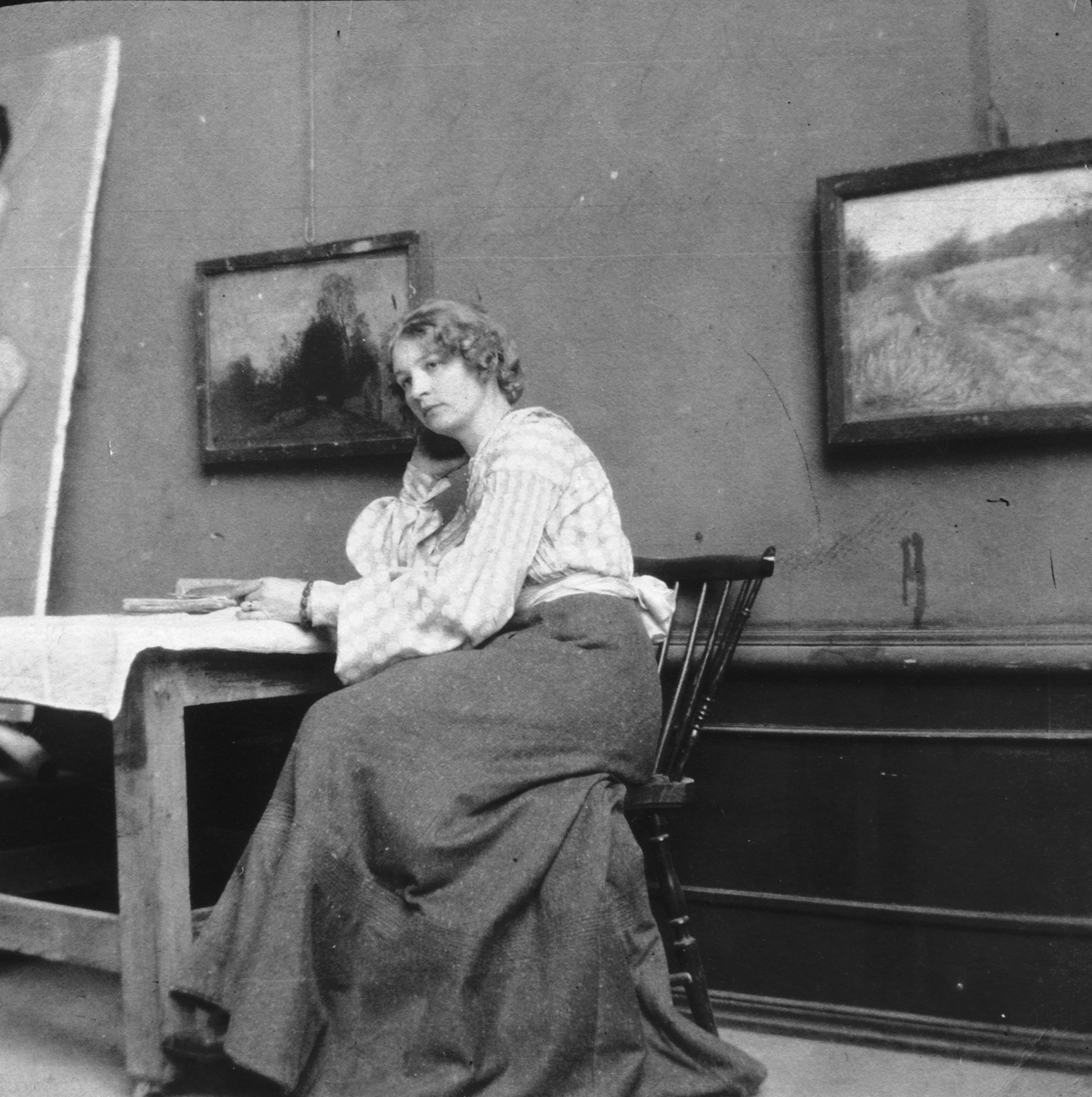 Ester Bauer sitter vid ett bord med böcker framför sig.