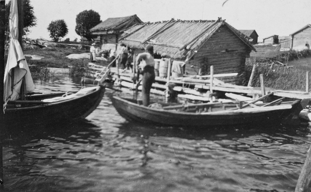 Båtar ligger förtöjda vid bryggan och människor är verksamma vid sjöbodarna.