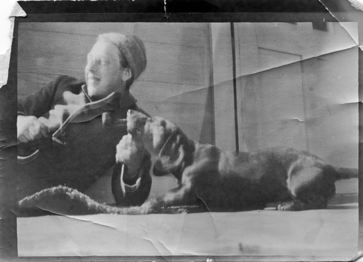 John Bauer som skämtsamt lånat ut sin kära pipa till sin tax, som var en trogen följeslagare på hans vandringar.