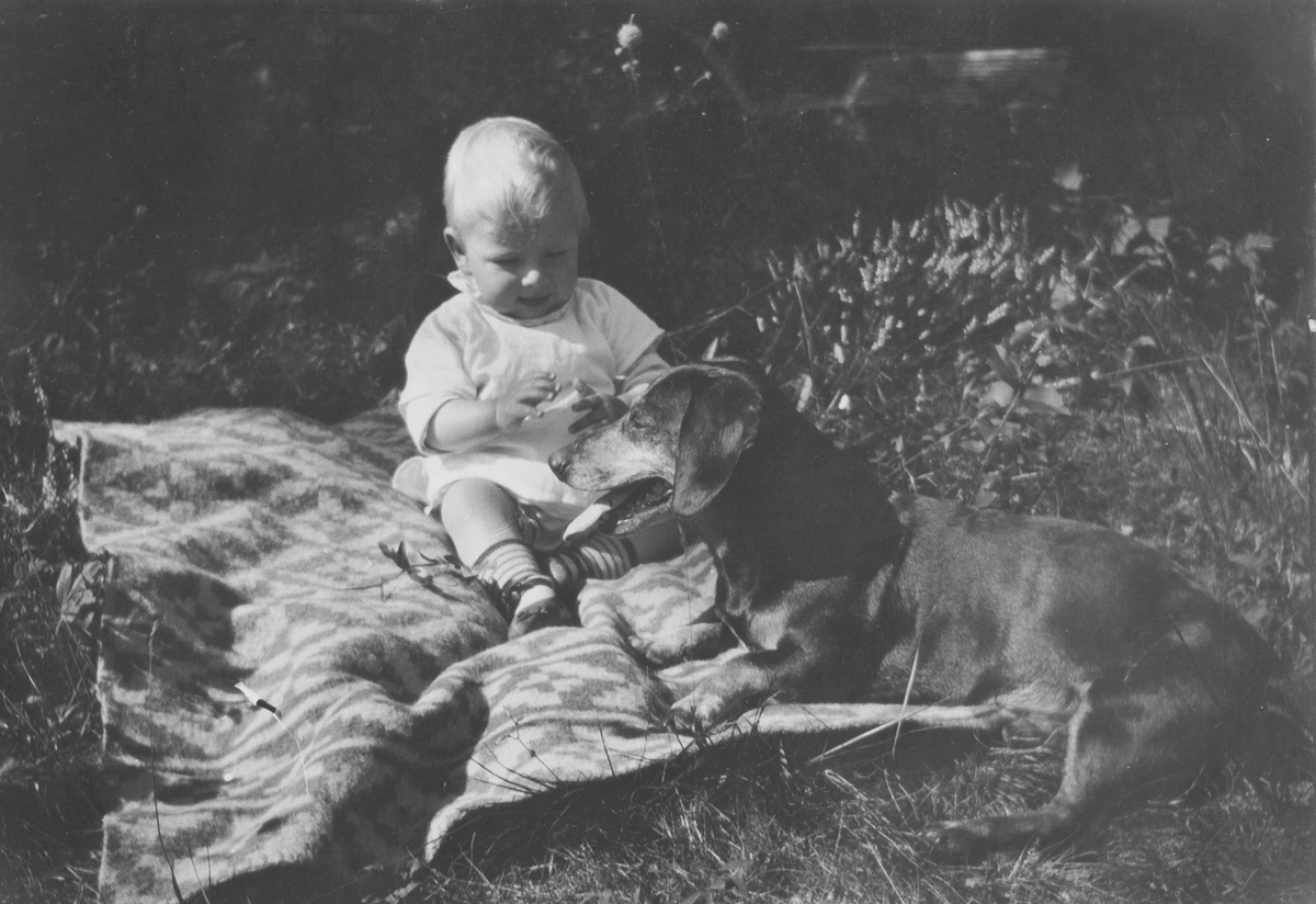 Bengt "Putte" Bauer och taxen "Pojken" på en filt, sommaren 1916.