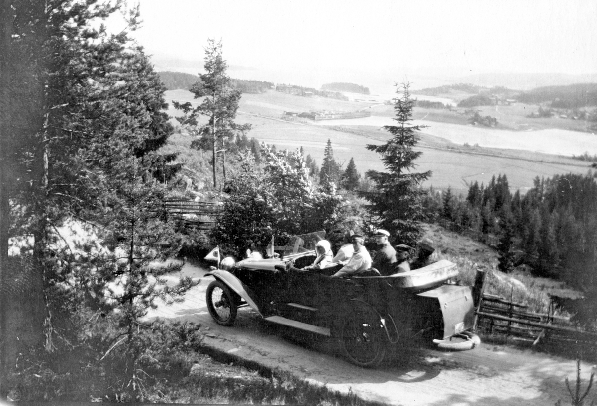 I en bil sitter John och Ester Bauer tillsammans med fyra män på en åktur genom landskapet.