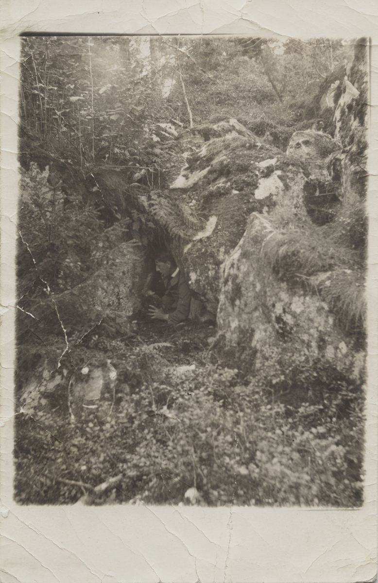 John Bauer i skogen med en modelldocka i en grotta vid sjön Bunn, Gränna.