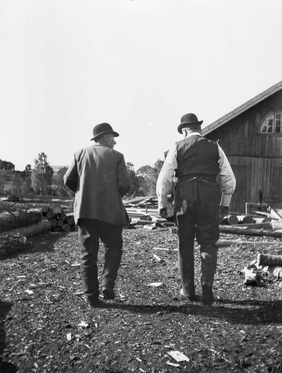 Två män går vid Västra Jära Vattensåg från 1860-talet. Till vänster skymtar bron över ån Nissan.