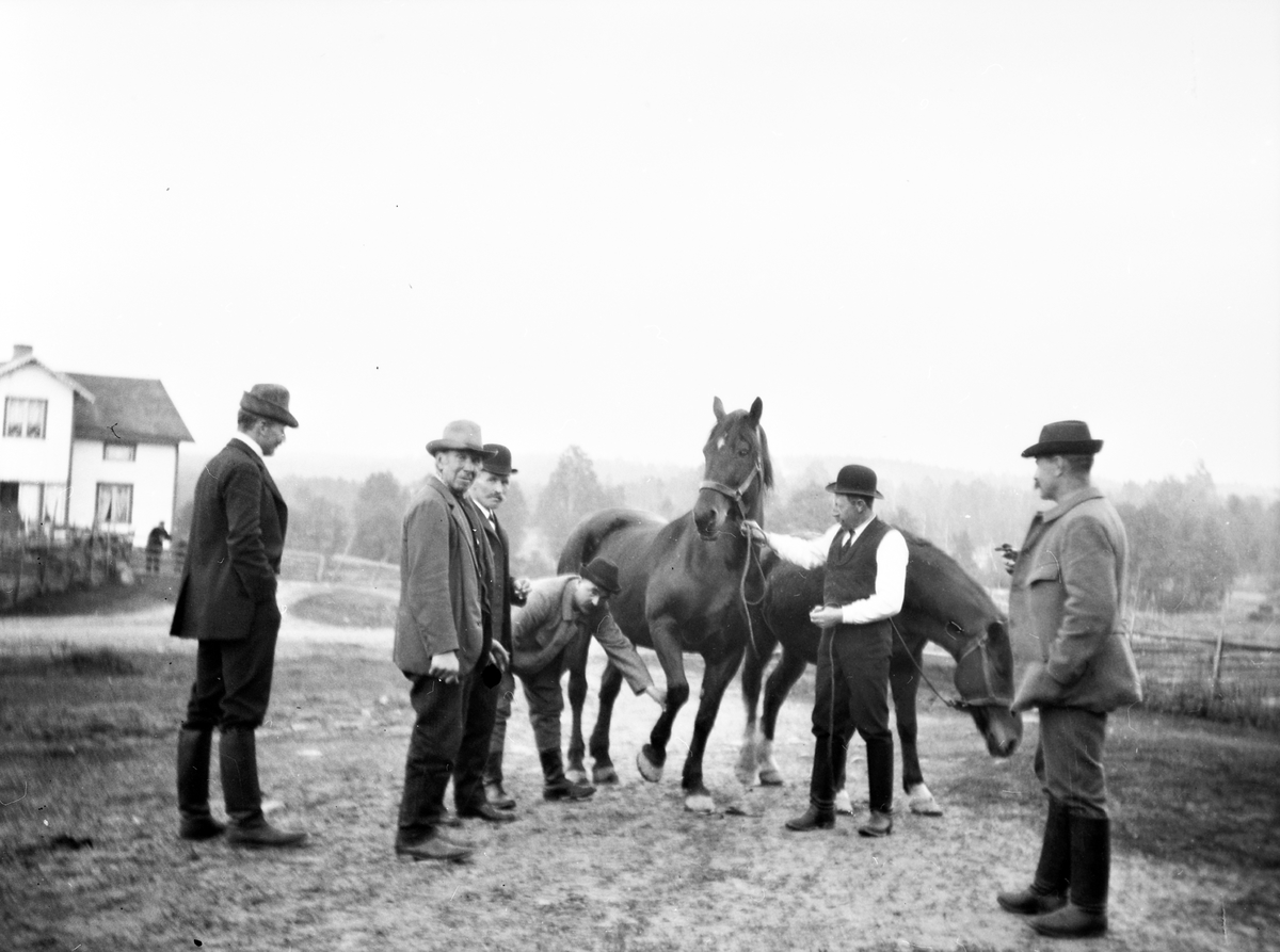 Hästmönstring. Bilden är tagen från Västra Jära Gästgivargårds gårdsplan. Huset till vänster heter Petersberg. Mellan Gästis och Petersberg går Göteborgsvägen. Mannen nr 2 från vänster kan vara Kalle på Kullen, en granne.
