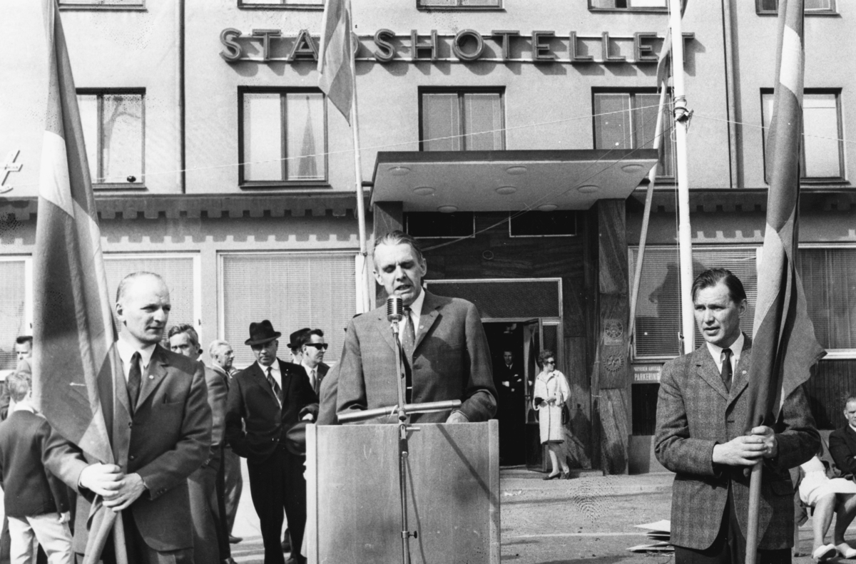 En man står och 1:a maj talar framför Stadshotellet i Vetlanda.