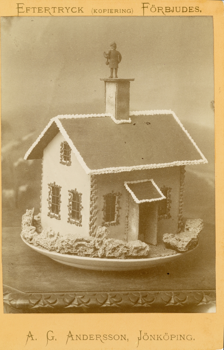 Ett hus gjort som en "Schweizerhydda" av konditor Arvid Östberg till B Sandvalls bröllop 1889-01-04.