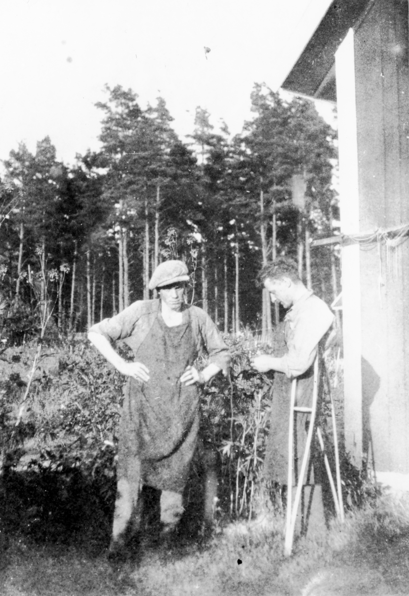 Filip Åberg (med kryckor) och Edvin Andersson var sko- och sadelmakargesäller hos Emil Lundin i Forsheda, Bredaryd.