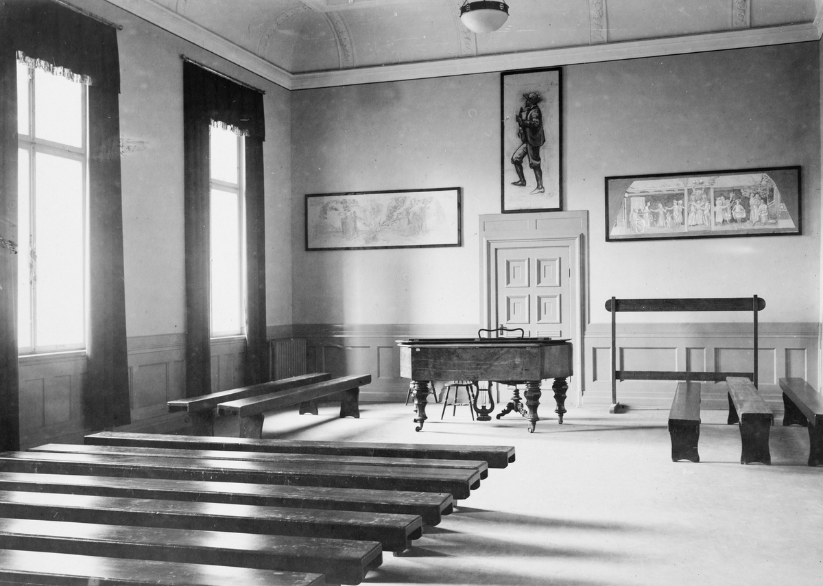 Jönköpings högre allmänna läroverk. En skolsal för musik. Omgiven av låga bänkar står ett musikinstrument, möjligtvis piano eller en mindre flygel.