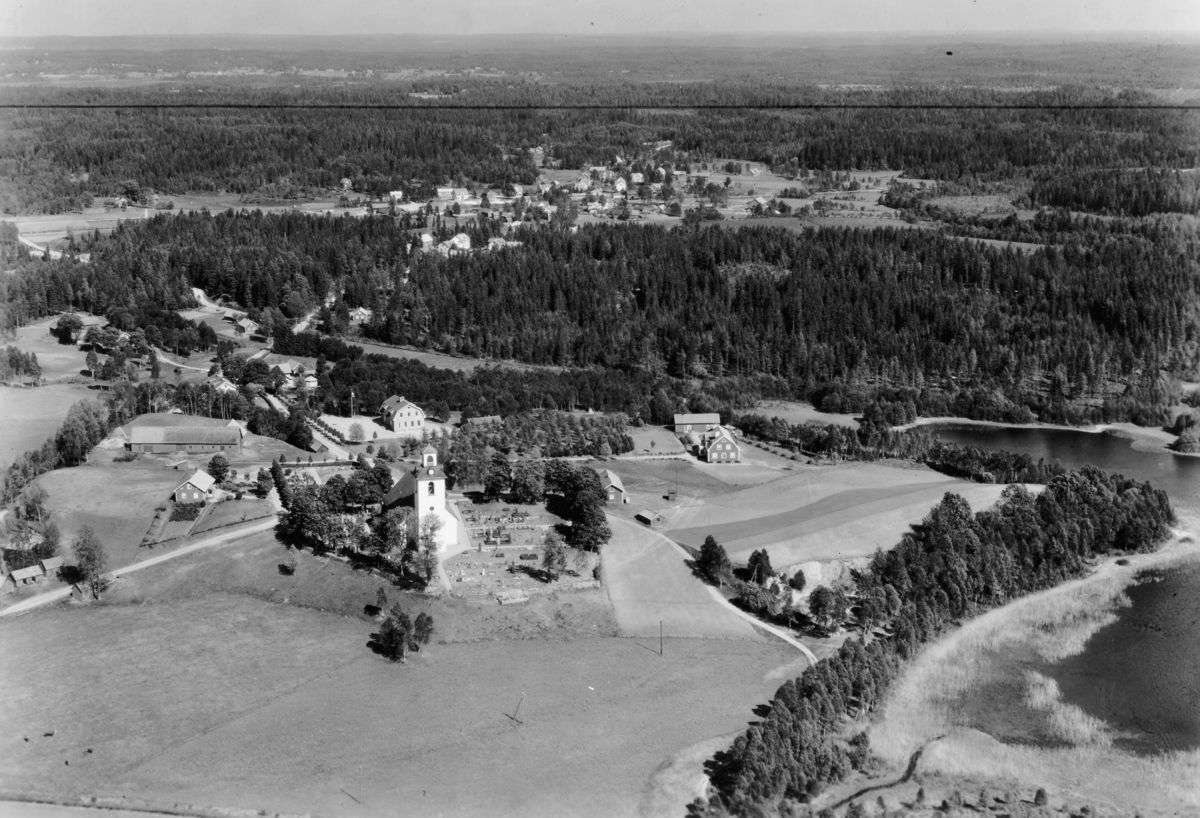 Flygfoto över området runt Södra Hestra Kyrka vid Broaryd i Gislaveds kommun. Nr G 1377.