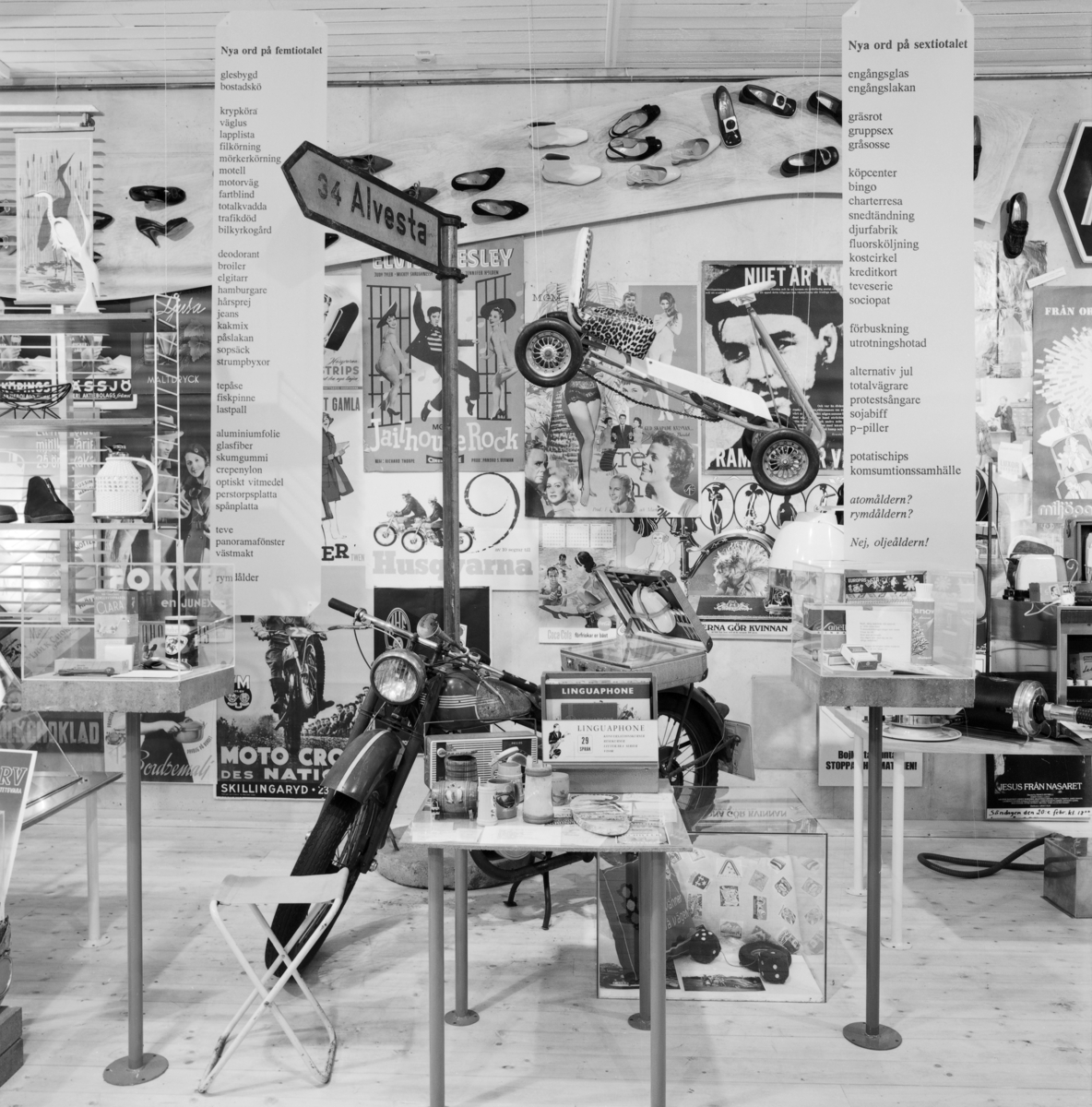 Utställning Tiotusen år. Utställningsdelen senare 1900-tal med motorcykeln Rödmyran, Husqvarna AB med Picknickväska på pakethållaren. Man ser även en hängande Trampebil med tidtypiska affisher i bakgrunden.