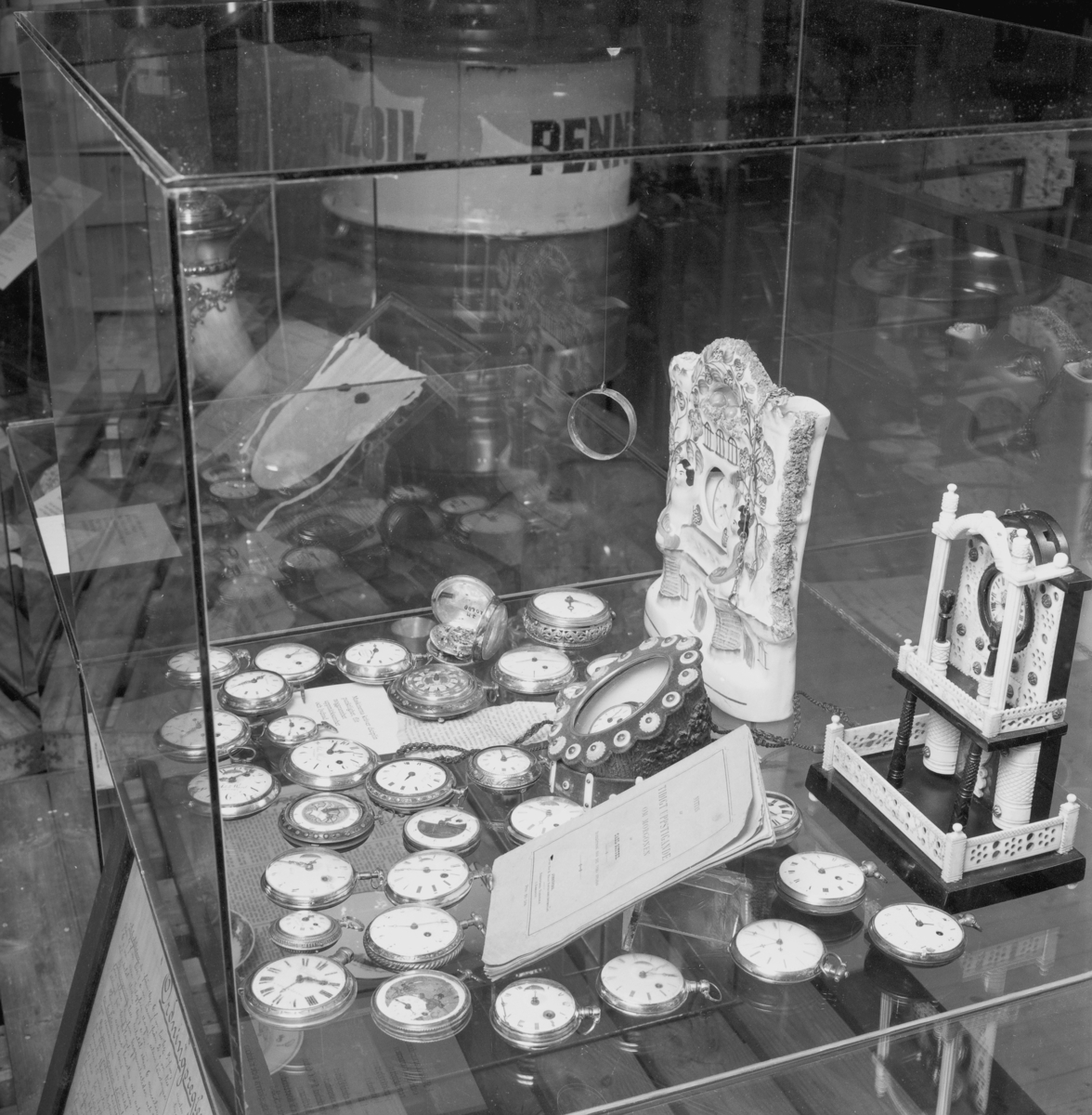 Utställning Tiotusen år. Utställningsdelen Tågvagnarna, glaslåda 5:2 med fickur från 1800-talet, solring solur av mässing, klockställ märkt 1866, klockställ av porslin från Staffordshire, England.