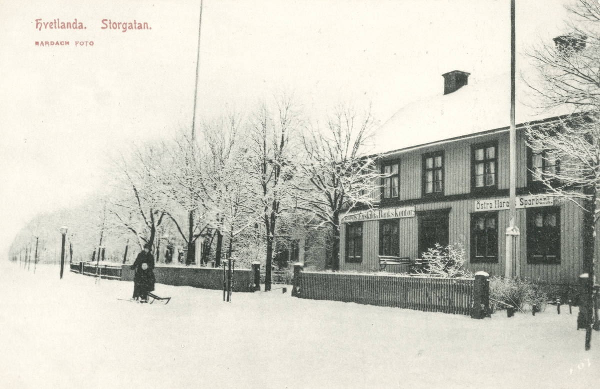 Vykort med Smålands Enskilda Banks Kontor och Östra Härads Sparbank vid Storgatan i Vetlanda.