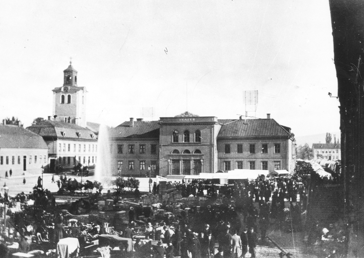 Marknad en torsdag på Hovrättstorget Jönköping. I bakgrunden Teaterhuset.