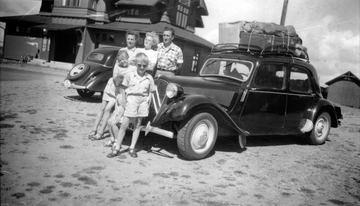 En familj på semester vid bilen med packning på taket.
