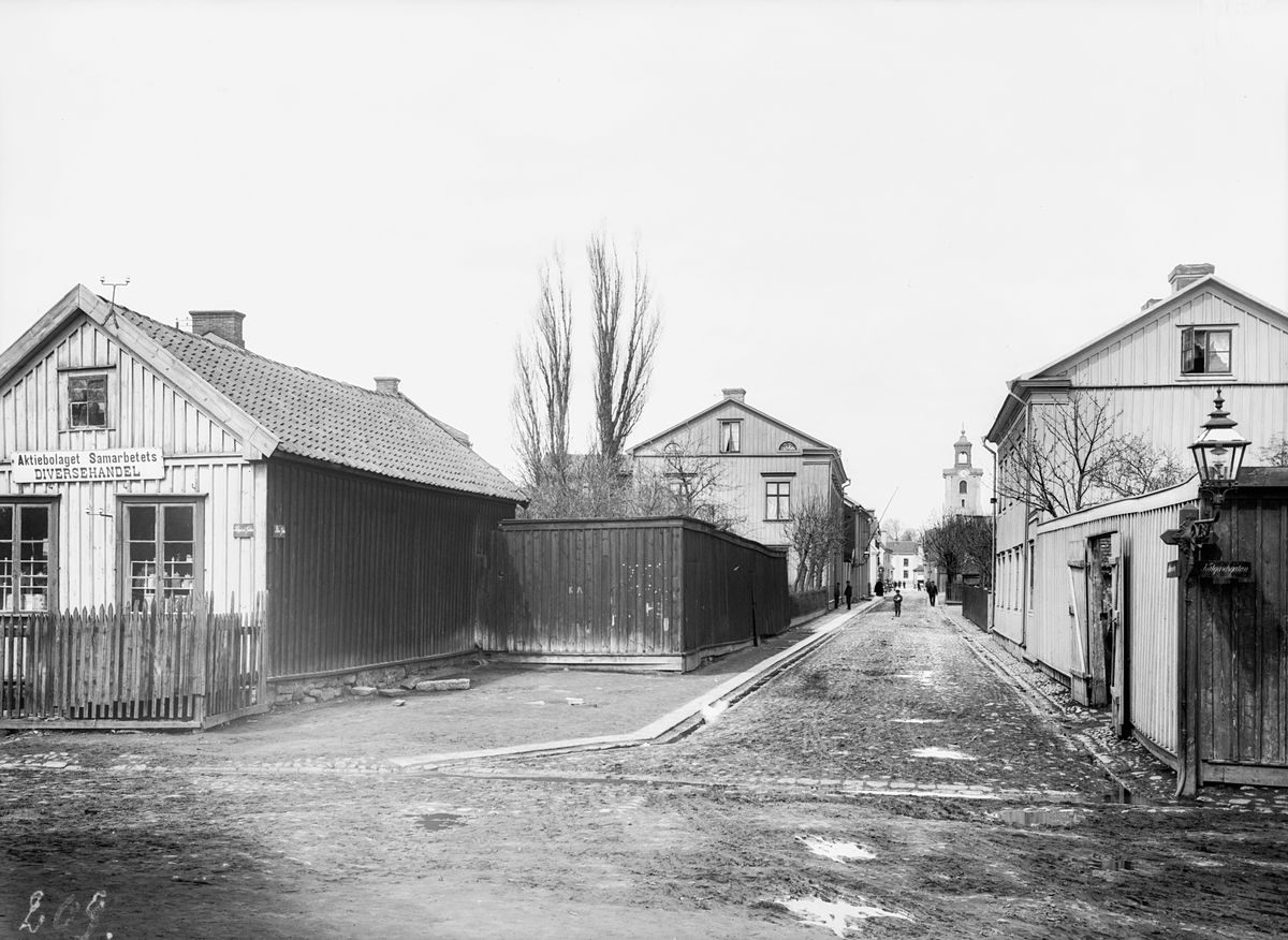 Målargatan norrut från Kålgårdsgatan i Jönköping. I Rosenholm till vänster ligger Aktiebolaget Samarbetets diversehandel. I bakgrunden skymtar tornet på Kristine kyrka.