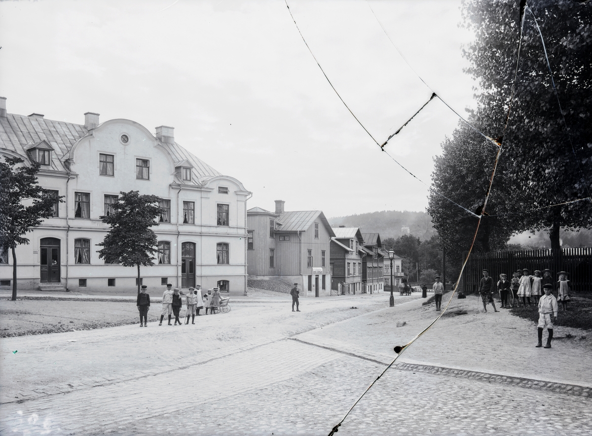 Kristinedalspartiet vid Kungsgatan mitt för Pilgatan i Jönköping. Stenhuset ritades 1902 av August Atterström.