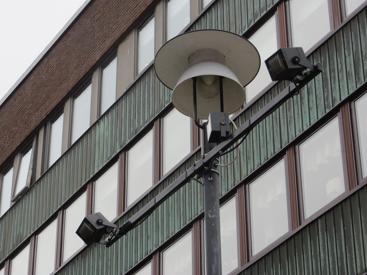 Detaljbild, nyuppsatt fasadbelysning på Karlagatan i Nässjö. Belysningen har satts upp för att lysa upp Nässjö stadshus.