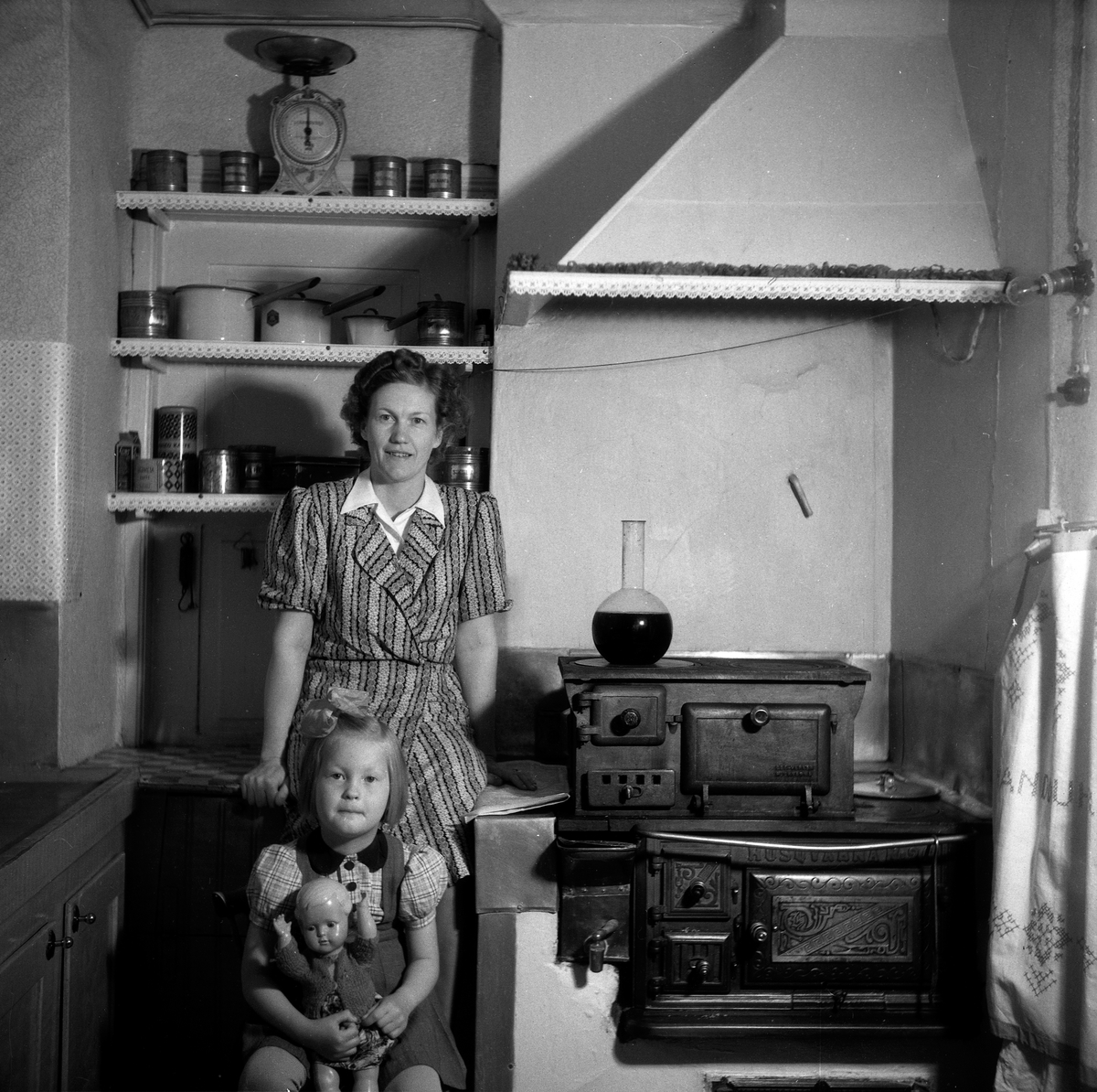 Familjen Tarle från Malmö var inneboende hos familjen Kvist på 2:a våningen på Skänkebergs gård i Jönköping. Herr Tarle var musiker och spelade på Alphyddan i Jönköpings stadspark under sommarsäsongen. På bilden ses fru Tarle med dotter i lägenhetens kök.