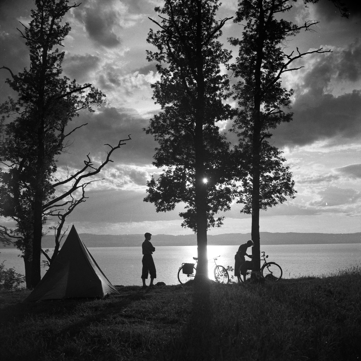Två pojkar som tältar vid Rosenlundsbankarna i Jönköping med utsikt över Vättern.